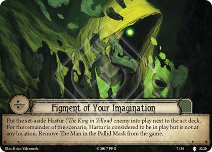 Hastur (The Tattered King) is spawned by this act and he is horrific to us, our ignorance causing his horror to resonate more than either of the other versions, causing a massive four sanity damage and one physical damage if that hit exceeds our sanity. On top of this he turns a bunch of tokens into autofails and will pursue us as a hunter across Carcosa.