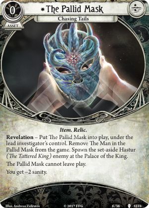 The next Act card has three flavours depending on which path we have chosen throughout the campaign. Each one does not allow us to discover clues anymore, and only finally dealing with The Man in the Pallid Mask, brought into play by the advancement of Act 1 will advance us through our tale.