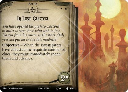 The first time I came across Act 1, I just loved it. The designers had been building to this point across the whole of the campaign, making us doubt the truth of our situation. We are just watching a play. We are just in Carcosa. Our reality is splitting. Our minds are beginning to break. Similarly the Agenda flip has us back in the confines of the Asylum and this idea is repeated throughout the Act and Agenda deck having us constantly question what the investigators are seeing.