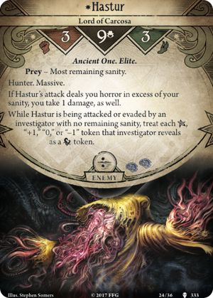 Version 3 is the path of Conviction. We know what Hastur is, we have read the signs and seen the truth, even if that knowledge has risked breaking our minds. Hastur as the Lord of Carcosa hunts us, is the hardest to kill and has a combination of the first two, being not as bad for sanity damage, like version 2, but changing the tokens, like version 1.